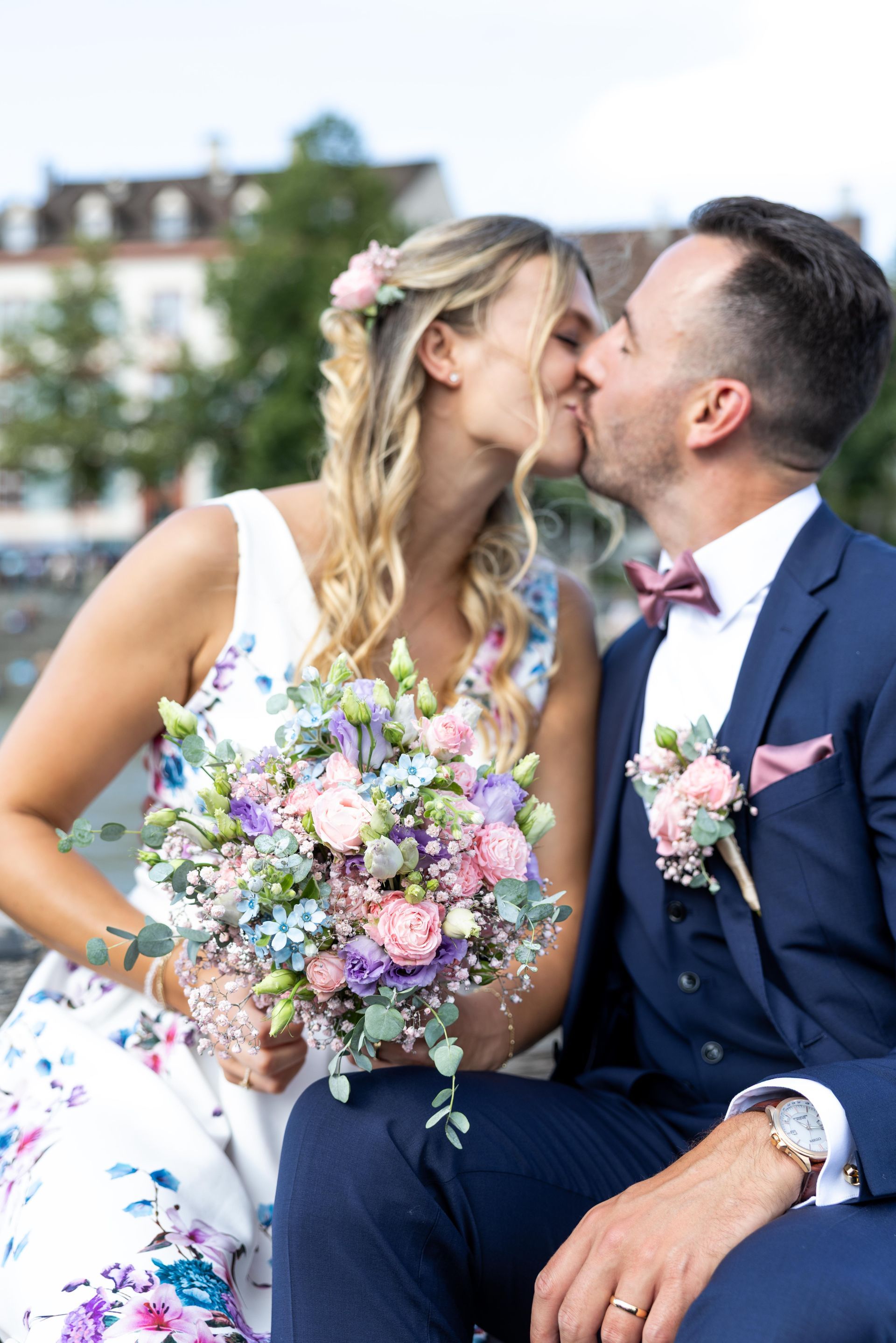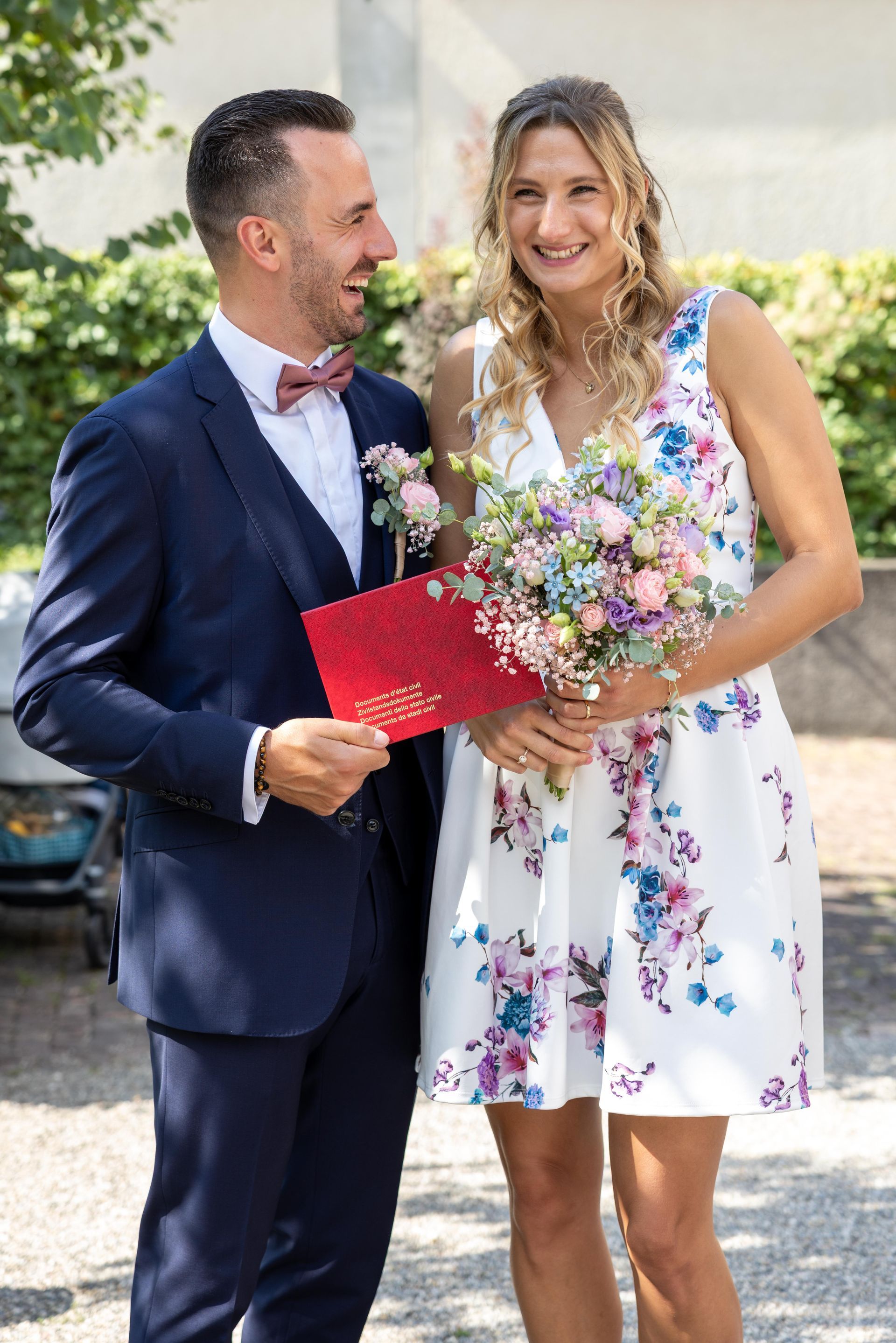 Bräutigam im marineblauen Anzug mit rosa Blumenboutonnière, bordeauxroter Fliege und Einstecktuch.